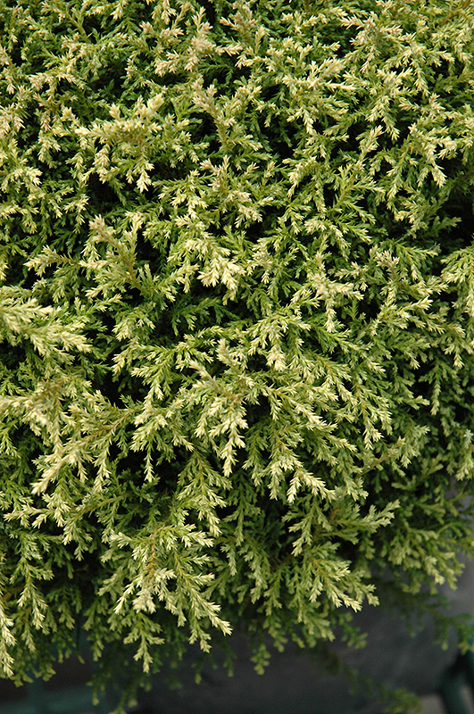 A variety of threadleaf falsecypress with fine, almost string-like brilliant gray-green foliage with cream variegation at the tips, giving an extremely fine texture; ideal for color and texture contrast in the garden; grows very slowly