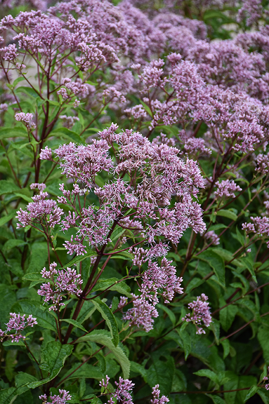 Phantom Joe Pye Weed has masses of beautiful plumes of lightly-scented lavender flowers with purple overtones at the ends of the stems from late summer to late fall, which emerge from distinctive fuchsia flower buds, and which are most effective when planted in groupings. The flowers are excellent for cutting. Its serrated narrow leaves emerge dark green in spring, turning forest green in color throughout the season. The burgundy stems can be quite attractive.