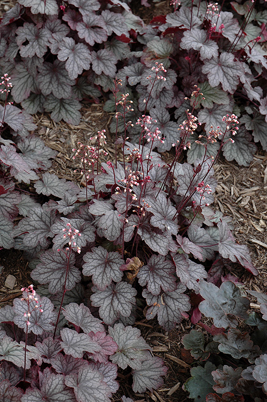 Dainty bells rise from a compact mound of silver-gray leaves that are flushed with rose pink, and have bright scarlet undersides; amazing contrast to other plants; greater heat and humidity tolerance; keep soil moist in heat of summer