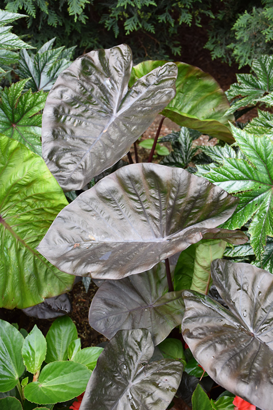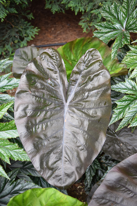Royal Hawaiian® Black Coral Elephant Ear is primarily valued in the landscape or garden for its cascading habit of growth. Its attractive enormous heart-shaped leaves remain burgundy in color with showy black variegation and tinges of dark red throughout the season.