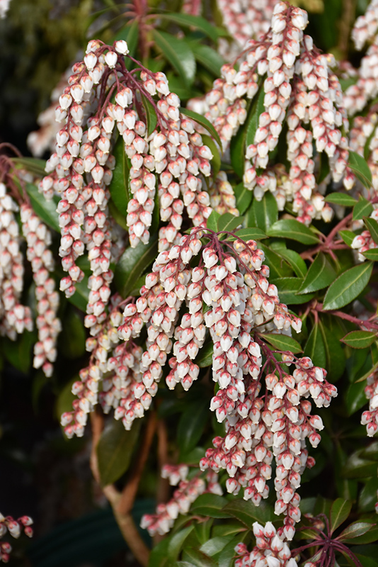 A highly ornamental broadleaf evergreen shrub, prized for its delicate and showy chains of pink-cream bell-shaped flowers and reddish emerging foliage, a dense and compact variety; performs best in moist, organic and acidic soils
