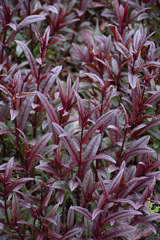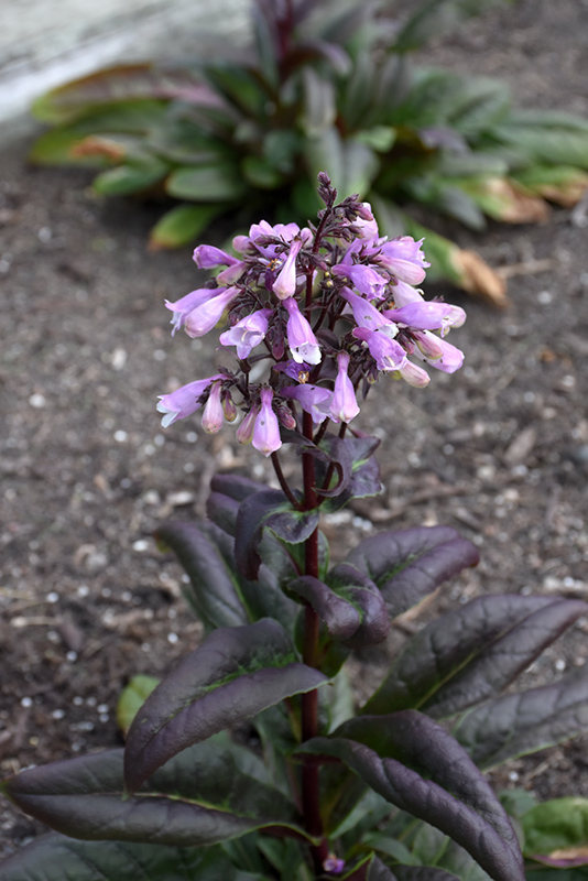 An impressive penstemon producing flowers in shades of lilac purple rising above deep eggplant purple foliage on equally dark stems; makes a beautiful visual impact when massed in the garden, along walkways, or in borders
