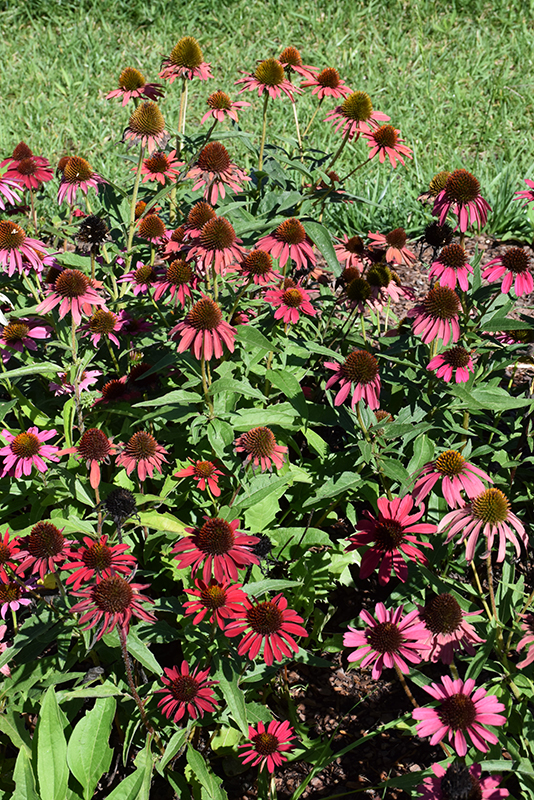 Intense, glowing watermelon coral petals around a dark cone; vigorous habit and produces a great number of crowns; attracts pollinators and feeds the birds at winter; an excellent landscape plant for vivid color; use in naturalized areas
