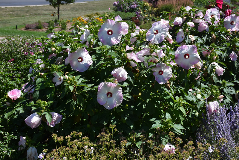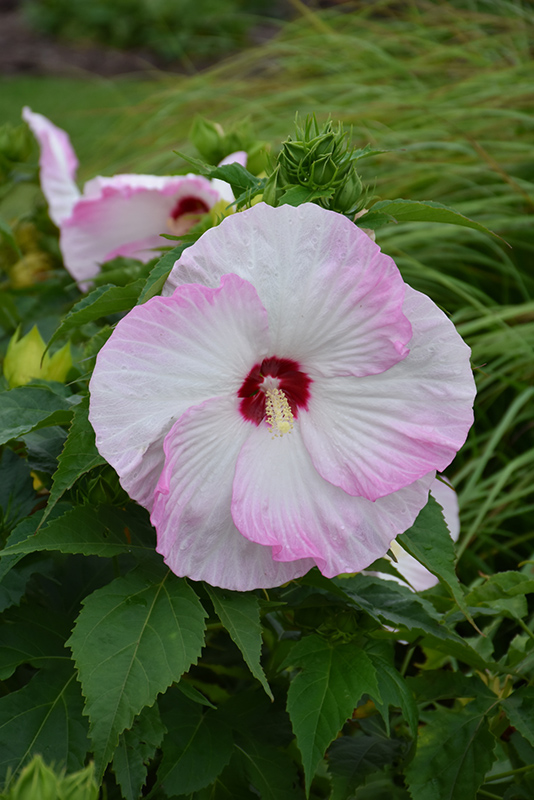 A beautiful and bold garden perennial featuring very showy white flowers with crimson eyes and blush pink edges; ideal for the mixed garden border or in mass; do not allow to dry to the point of wilting