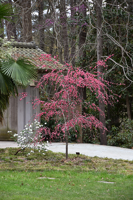 Crimson Cascade Weeping Peach will grow to be about 12 feet tall at maturity, with a spread of 8 feet. It has a low canopy with a typical clearance of 2 feet from the ground, and is suitable for planting under power lines. It grows at a medium rate, and under ideal conditions can be expected to live for 40 years or more.