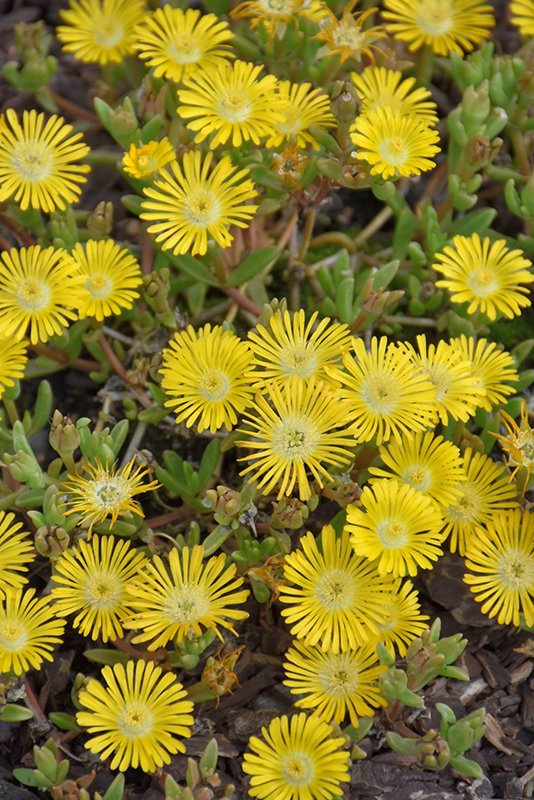 A low growing succulent, native to South Africa but amazingly hardy in North America; dazzling yellow daisy-like flowers with white centers; green foliage has burgundy overtones in fall; perfect for xeriscapes, rock gardens, screes and sandy soils