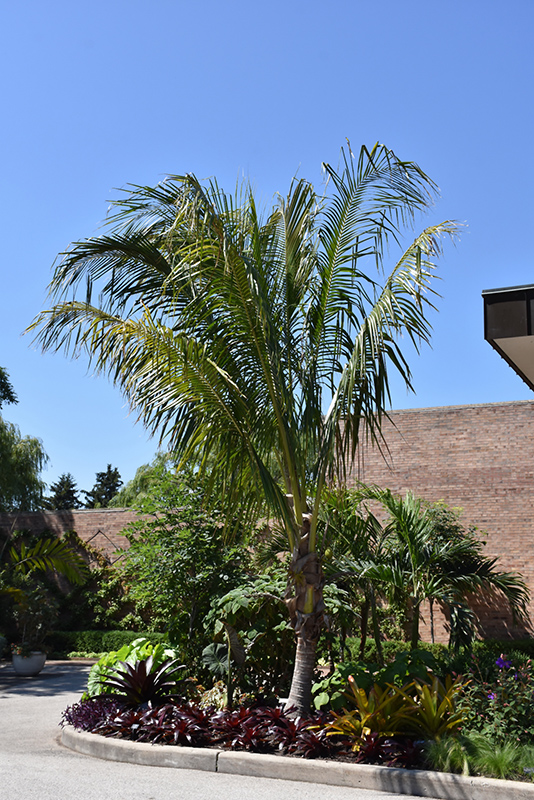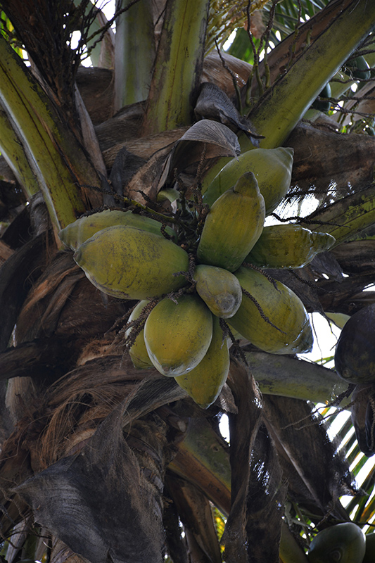 Coconut Palm has clusters of fragrant yellow flowers hanging below the branches from mid to early winter. It has attractive dark green evergreen foliage. The large glossy narrow pinnately compound leaves are highly ornamental and remain dark green throughout the winter. The fruits are showy green drupes which fade to brown over time, which are carried in abundance from mid to early winter. The fruit can be messy if allowed to drop on the lawn or walkways, and may require occasional clean-up. The smooth gray bark is extremely showy and adds significant winter interest.