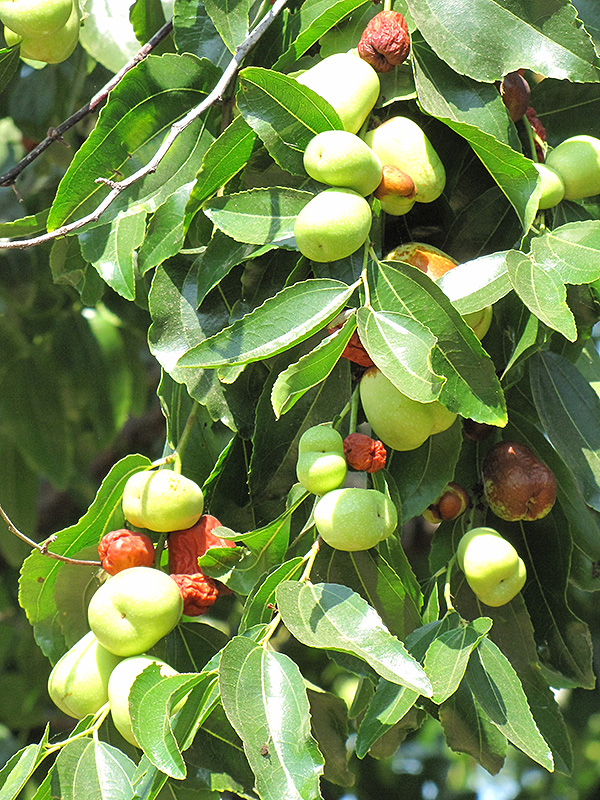 Lang Jujube is primarily grown for its highly ornamental fruit. The fruits are showy dark brown drupes with brick red overtones, which are carried in abundance from late summer to mid fall. The fruit can be messy if allowed to drop on the lawn or walkways, and may require occasional clean-up. It features subtle fragrant white flowers with chartreuse overtones at the ends of the branches from early to mid summer. It has green foliage with light green veins. The serrated oval leaves do not develop any appreciable fall color.