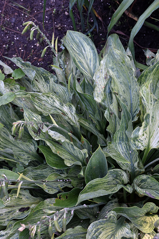 An eye-catching and interesting variety featuring large mounds of light green foliage speckled and margined with deep green; near white to pale lavender flowers appear on tall scapes during the mid-summer months; an excellent addition to beds and borders