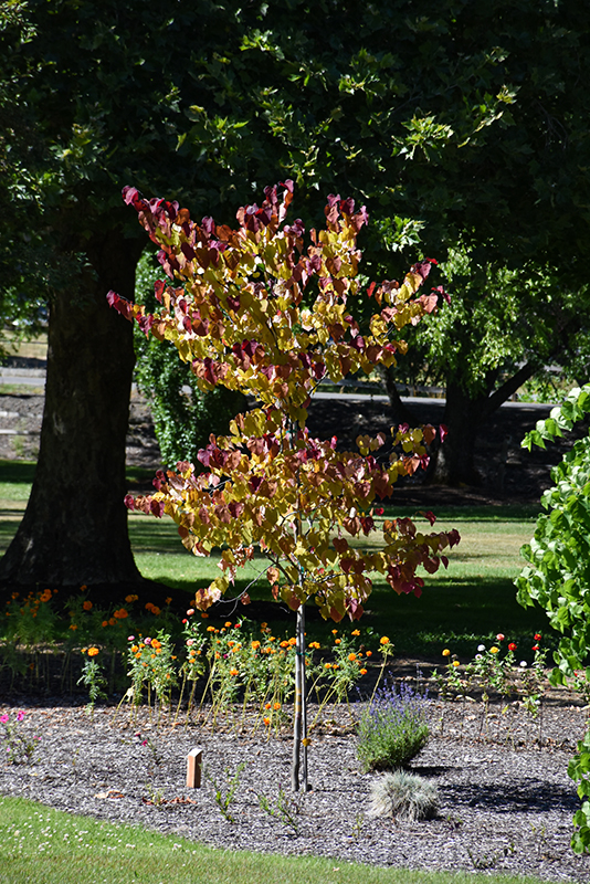 Flame Thrower® Redbud features showy hot pink pea-like flowers with dark red calyces along the branches from early to mid spring before the leaves. It has attractive yellow-variegated lime green foliage with hints of red which emerges burgundy in spring. The glossy heart-shaped leaves are highly ornamental and turn outstanding shades of orange and in the fall.