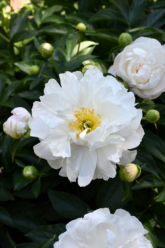A lovely early mid-season bloomer presenting shell pink flower buds, opening to bright white with yellow anthers; vigorous bushy mounds of deep green, glossy foliage; excellent cut flower quality; perfect for border planting and garden beds
