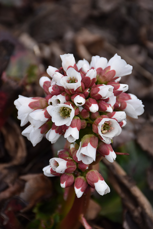 Happily Ever After Bergenia features unusual spikes of white bell-shaped flowers rising above the foliage from early to mid spring. Its large heart-shaped leaves remain forest green in color throughout the year. The dark red stems are very colorful and add to the overall interest of the plant.
