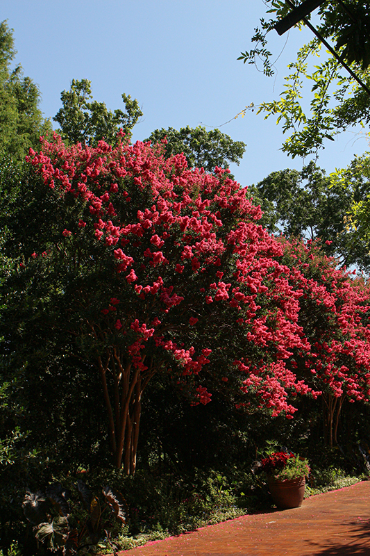 This spectacular ornamental shrub or small tree is covered in rich coral blooms in summer, over contrasting near-black, glossy foliage; a captivating focal point for the garden or border