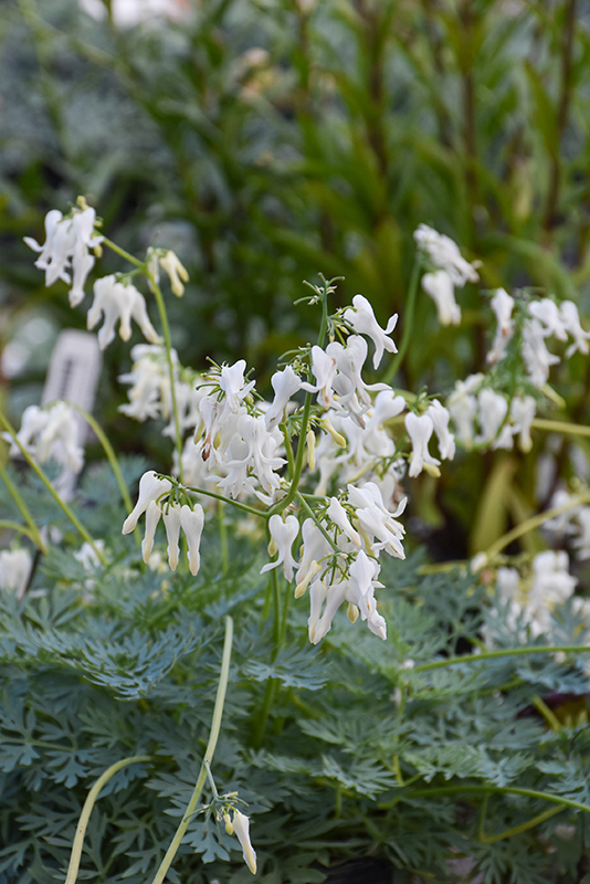 Lacy blue-green foliage on a compact mound with delicate, pure-white dangling heart-shaped flowers on gracefully arching stems, like little jewels in the garden; likes moist, shady areas