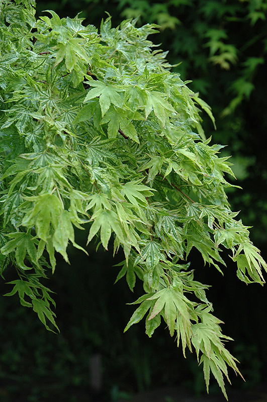 This interesting variety features striking green leaves with wide creamy variegation and rose edges which emerge pinkish in spring; habit is upright to almost columnar making it quite unique among most Japanese maples, an ideal accent for the landscape