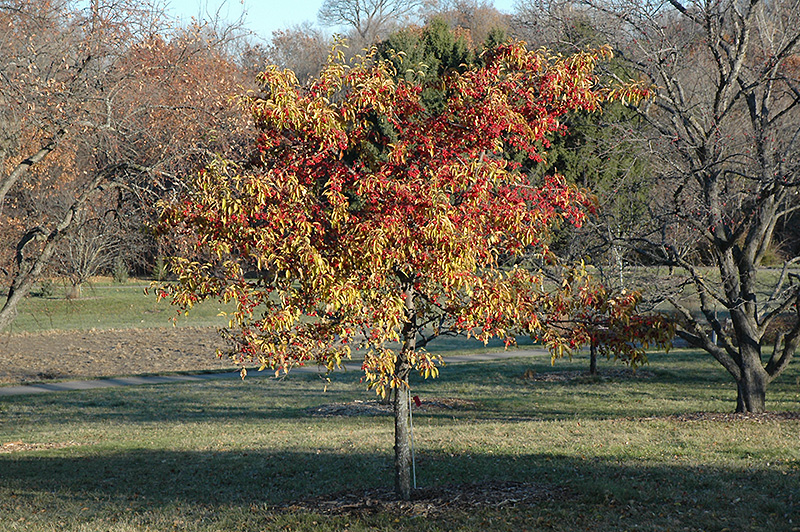 A popular ornamental tree that's completely smothered in fragrant pure white flowers in spring and persistent red fruit in fall, upright habit of growth; the definitive ornamental accent for the front yard, needs well-drained soil and full sun