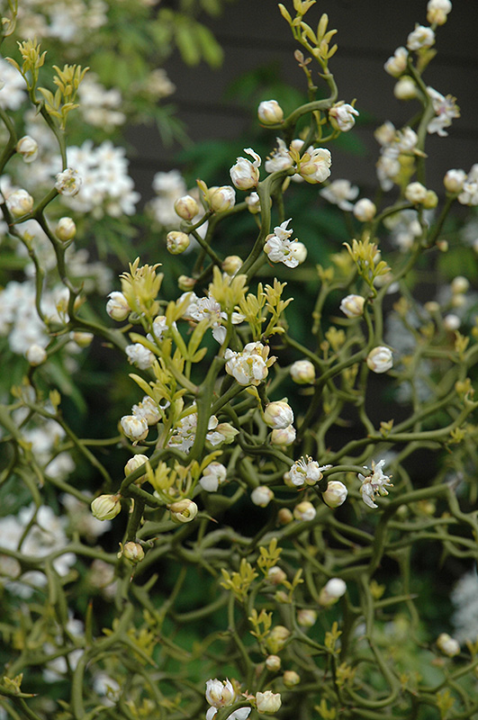 Flying Dragon Japanese Bitter Orange features showy clusters of lightly-scented white star-shaped flowers at the ends of the branches in early spring before the leaves. The fruits are showy orange pomes carried in abundance in mid summer. It has dark green deciduous foliage which emerges light green in spring. The glossy oval compound leaves turn gold in fall.