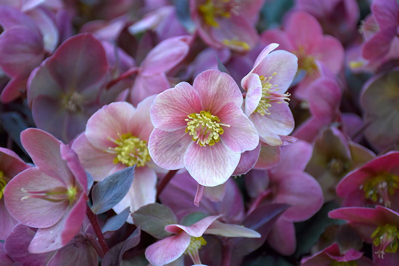 Pink Frost Hellebore features showy nodding shell pink cup-shaped flowers with white overtones and buttery yellow eyes at the ends of the stems from late winter to early spring, which emerge from distinctive pink flower buds. Its attractive oval compound leaves remain grayish green in color throughout the year.