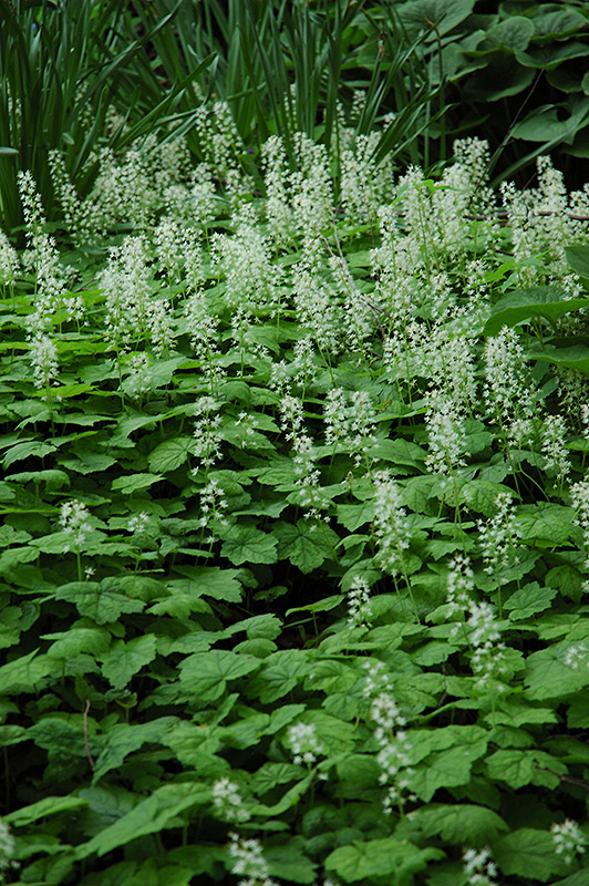 Creeping Foamflower will grow to be only 6 inches tall at maturity extending to 12 inches tall with the flowers, with a spread of 24 inches. When grown in masses or used as a bedding plant, individual plants should be spaced approximately 18 inches apart. Its foliage tends to remain low and dense right to the ground. It grows at a fast rate, and under ideal conditions can be expected to live for approximately 10 years. As an evegreen perennial, this plant will typically keep its form and foliage year-round.